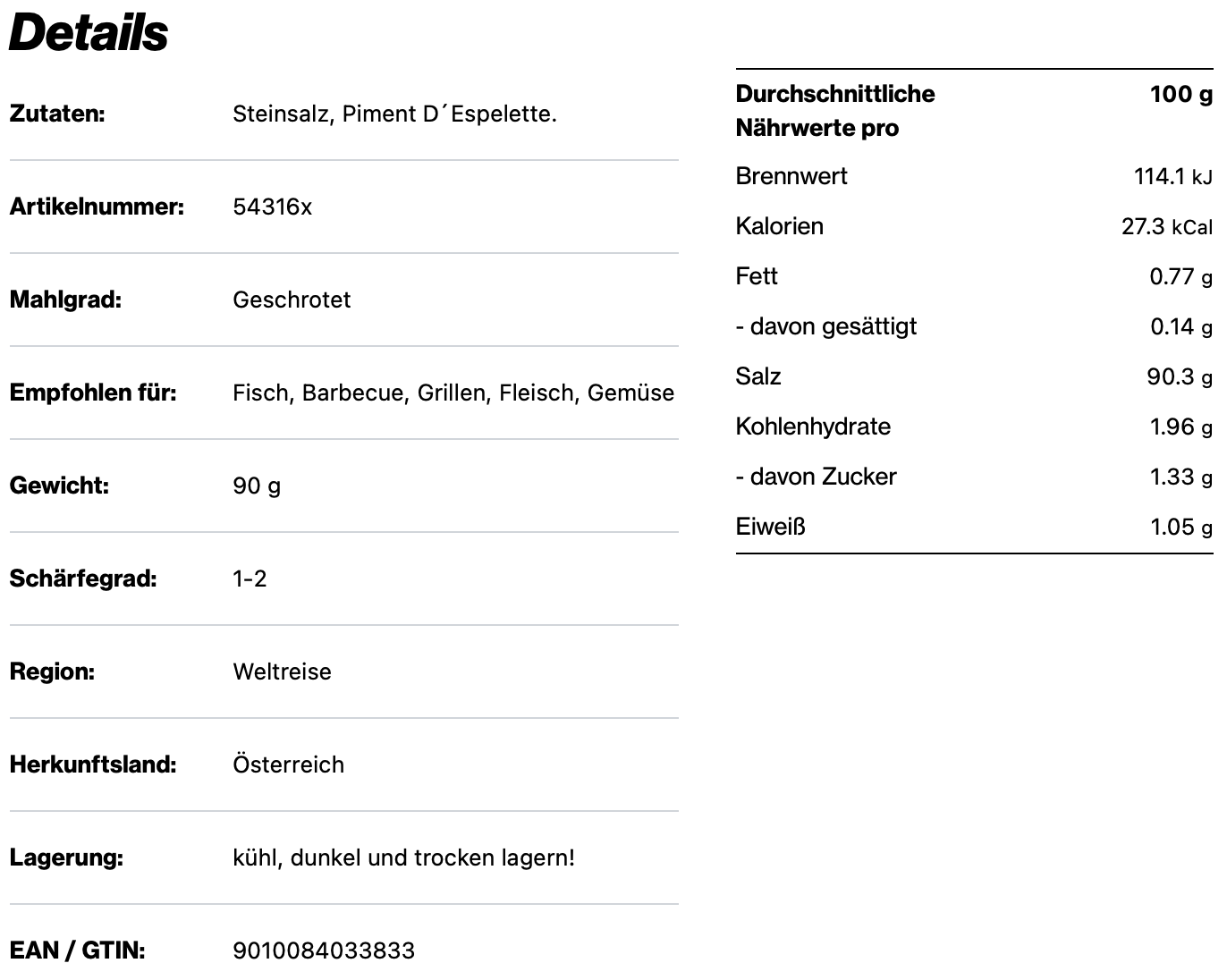 Diese Salzspezialität eignet sich ausgezeichnet zum Abschmecken von Fisch- & Meeresfrüchte-Delikatessen, verleiht Saucen, Dressings und Dips eine elegante Schärfe, ist das Tüpfelchen auf dem Geschmacks-i bei Ei-Gerichten und begeistert ebenfalls bei mediterranen Köstlichkeiten wie Pizza und Pasta und selbstverständlich auch bei Fleischgerichten. Die Verbindung von Halit – auch als Steinsalz bekannt – und dem edlen baskischen Chili Piment d’Espelette sorgt dabei für außergewöhnliche Geschmackserlebnisse.