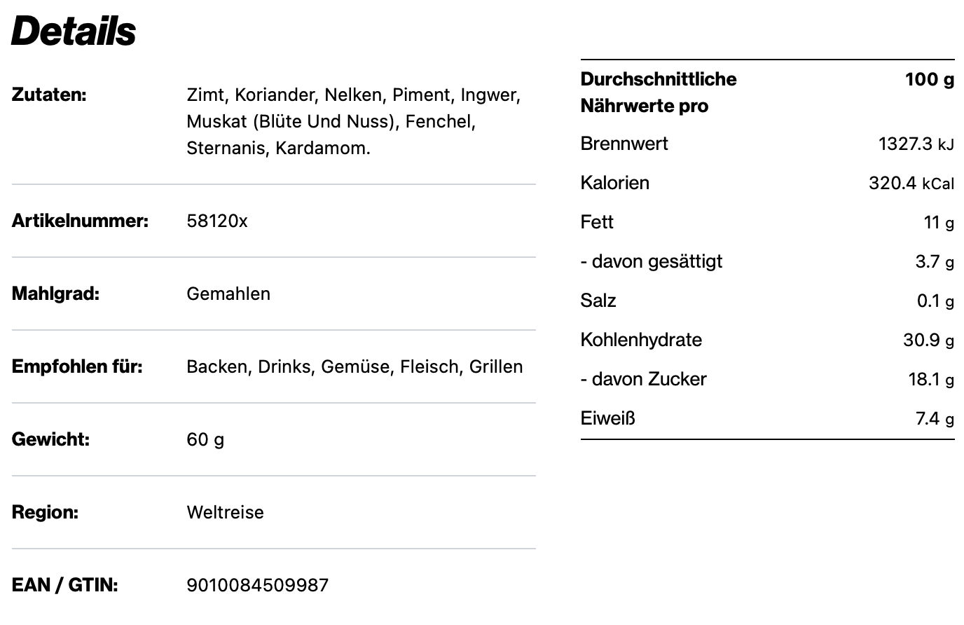 Zimt, Koriander, Nelke, Piment, Ingwer, Muskat, Fenchel, Sternanis, Kardamom